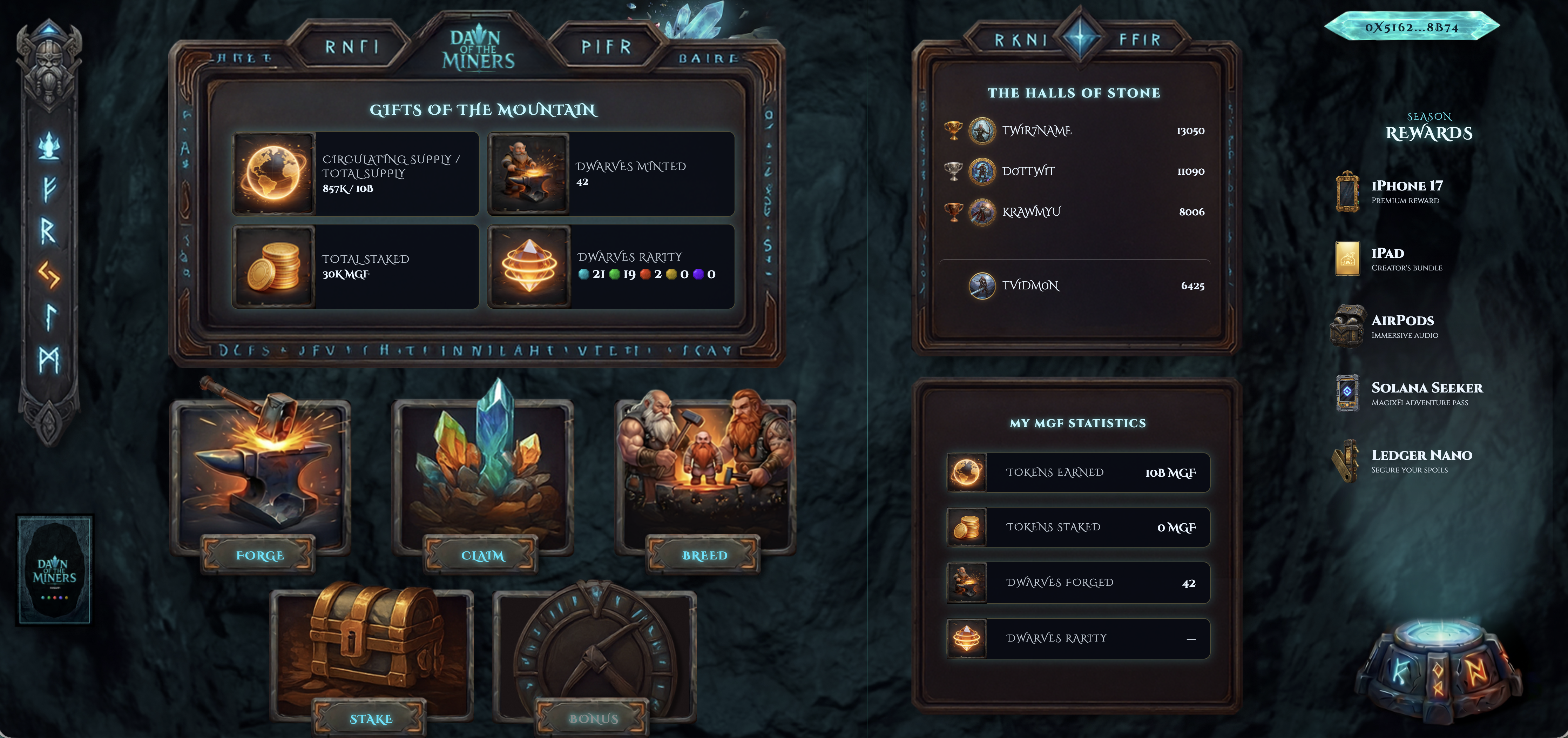 Dawn of The Miners is MagixFi’s Season 0—the first playable chapter that turns DeFi actions into a narrative-driven progression loop. Users mint Dwarf NFTs that represent either liquidity positions (Bankers) or pure mining positions (Explorers), then stake MGF to “awaken” them and activate mining, XP, streaks, quests, and seasonal rankings. In practice, it’s the onboarding season that showcases MagixFi’s core offer: a non-custodial gamification layer on top of DeFi, where “dungeons” are real liquidity pools and participation becomes an evolving, transferable identity rather than a static position.