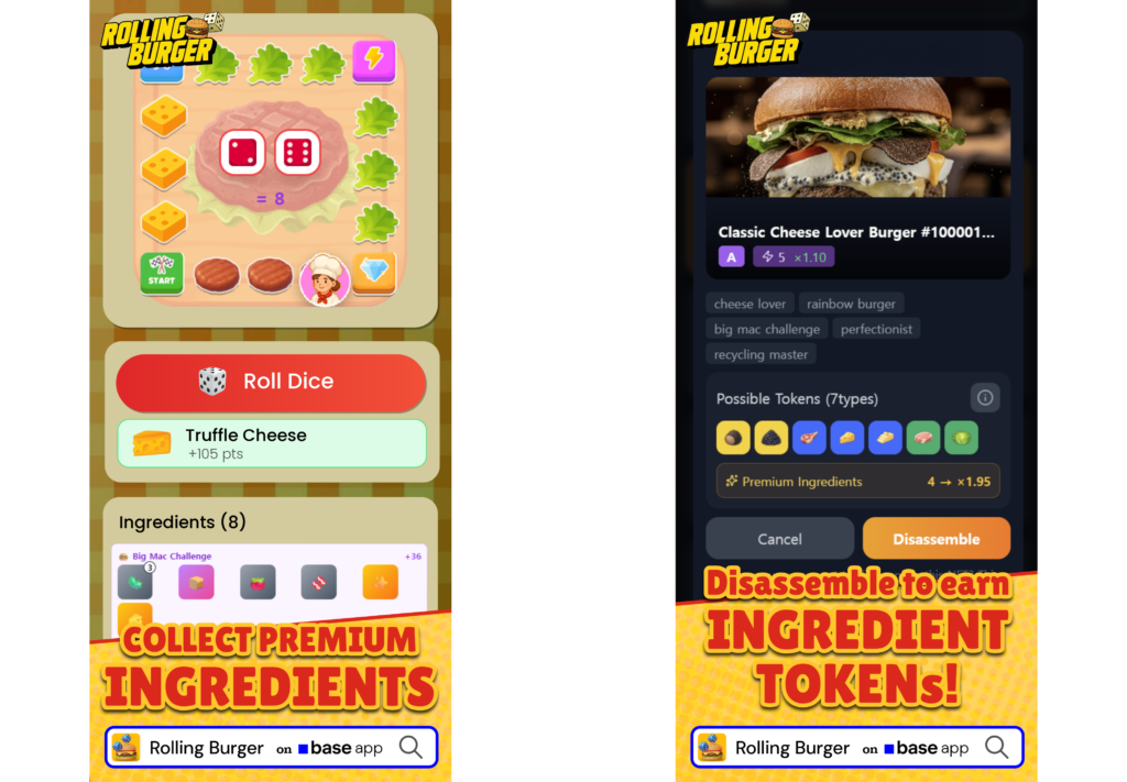 In Rolling Burger, players can break down burgers earned through play into ingredient tokens, and those assets aren’t locked to one game. The result of a session carries forward across the series and can even connect to broader cultural or market trends outside the game. For example, when K food gains global attention, a K food themed restaurant game can naturally emerge and drive demand for specific ingredients.