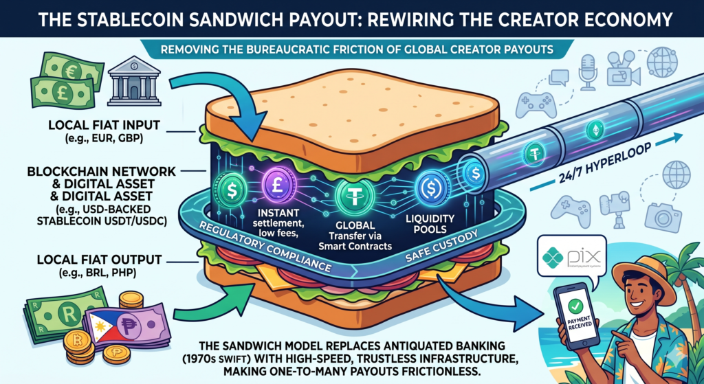 E-commerce solved the “many-to-one” pay-in pipeline ages ago via standardized APIs and dominant merchant acquirers. But paying creators out is a fragmented, “one-to-many” logistical nightmare. When a studio tries to route funds globally, they are forced onto antiquated SWIFT networks that act like analog toll roads. A single payment might bounce through three or four correspondent banks, bleeding value to FX fees at every single hop.
